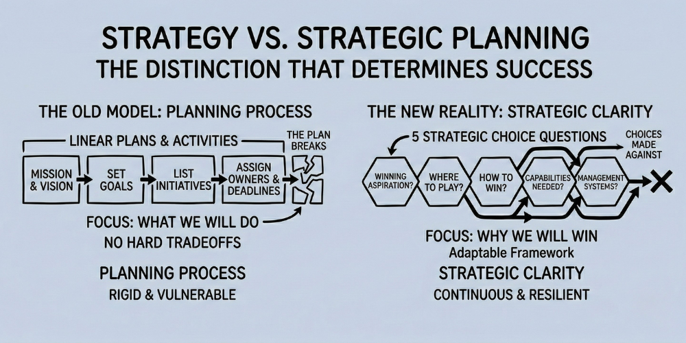 This is not wordplay. The distinction is practical. Strategy is the act of making choices about where to compete and how to win. Strategic planning is the process of documenting goals, timelines, and activities. One requires difficult tradeoffs. The other organizes work that has already been decided.