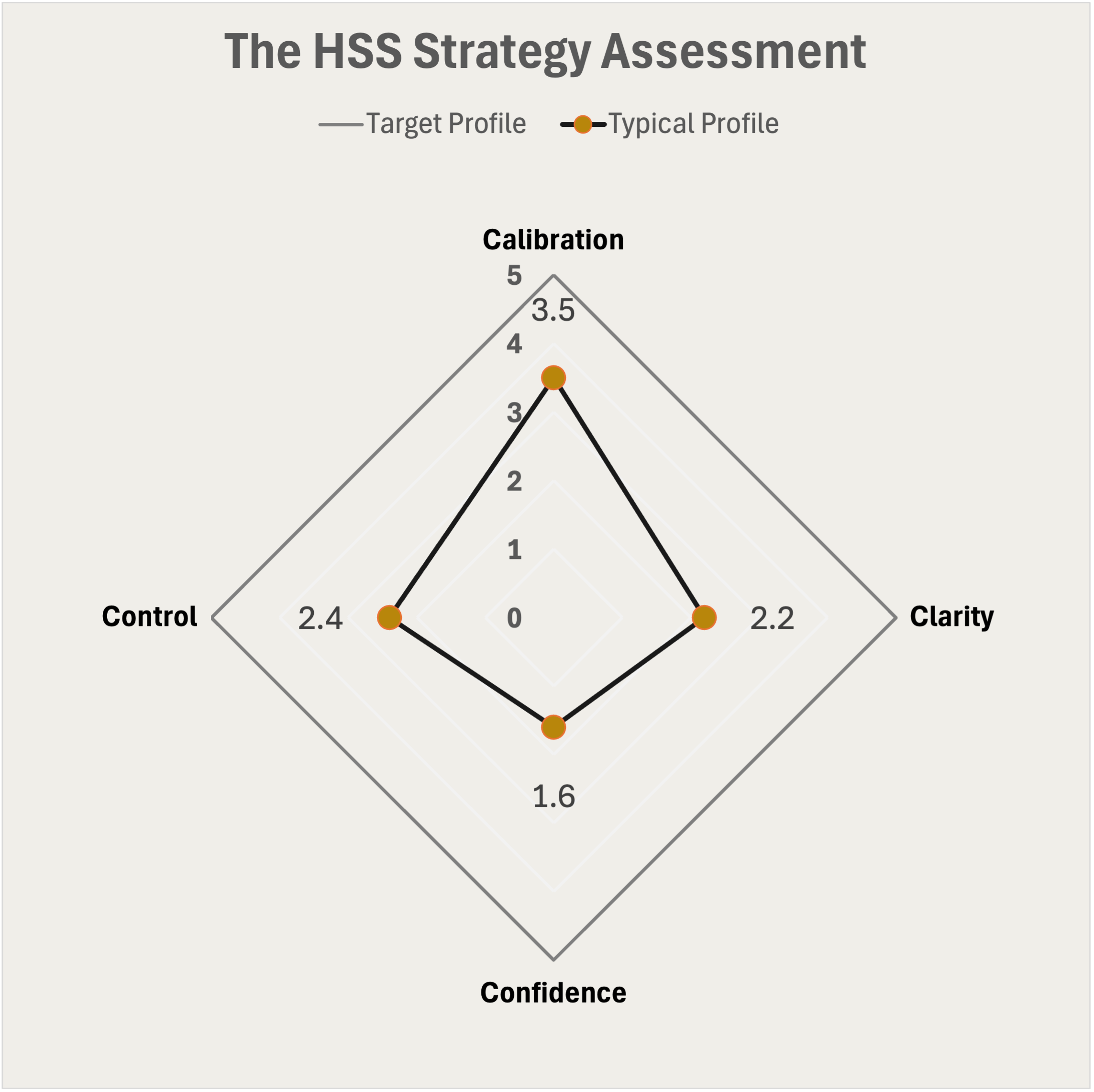 The Professional Output: The full Strategy Assessment moves beyond "Yes/No" Strategic Audit questions, and measures your firm on a 1–5 Maturity Matrix scale for each element. It generates a symmetrical profile (see below) of your strategic health, pinpointing your strengths and opportunities for improvement to deploy capital and talent.