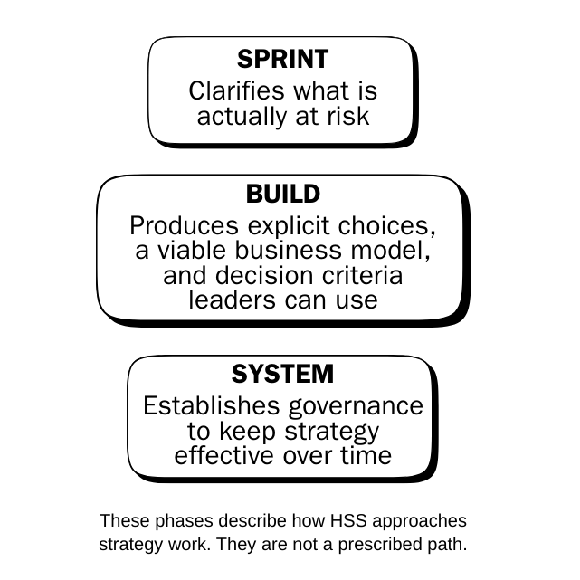 HSS exists to close that gap. We help leaders turn intent into explicit choices, a coherent business model, and decision criteria that hold up when decisions must be made under pressure.